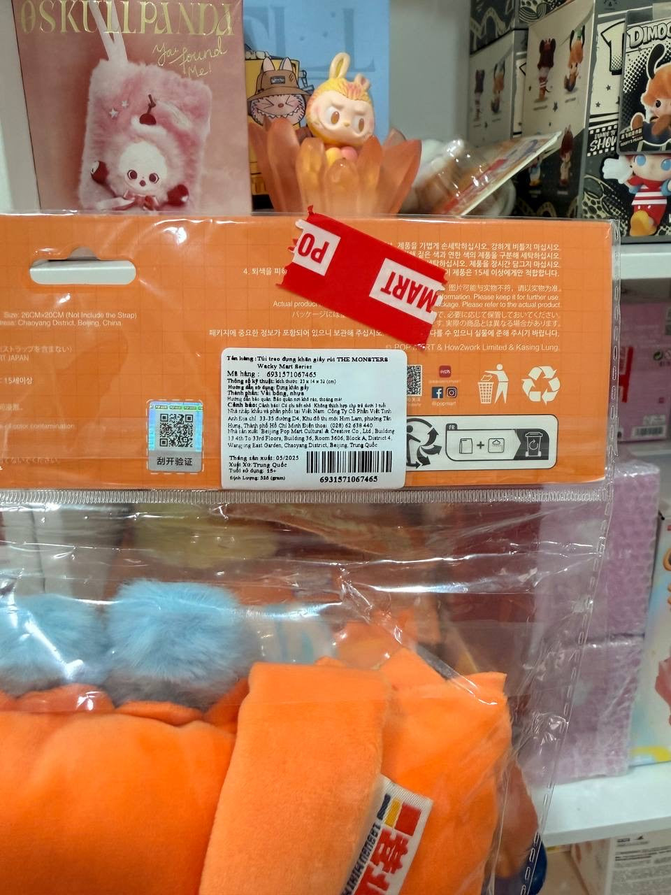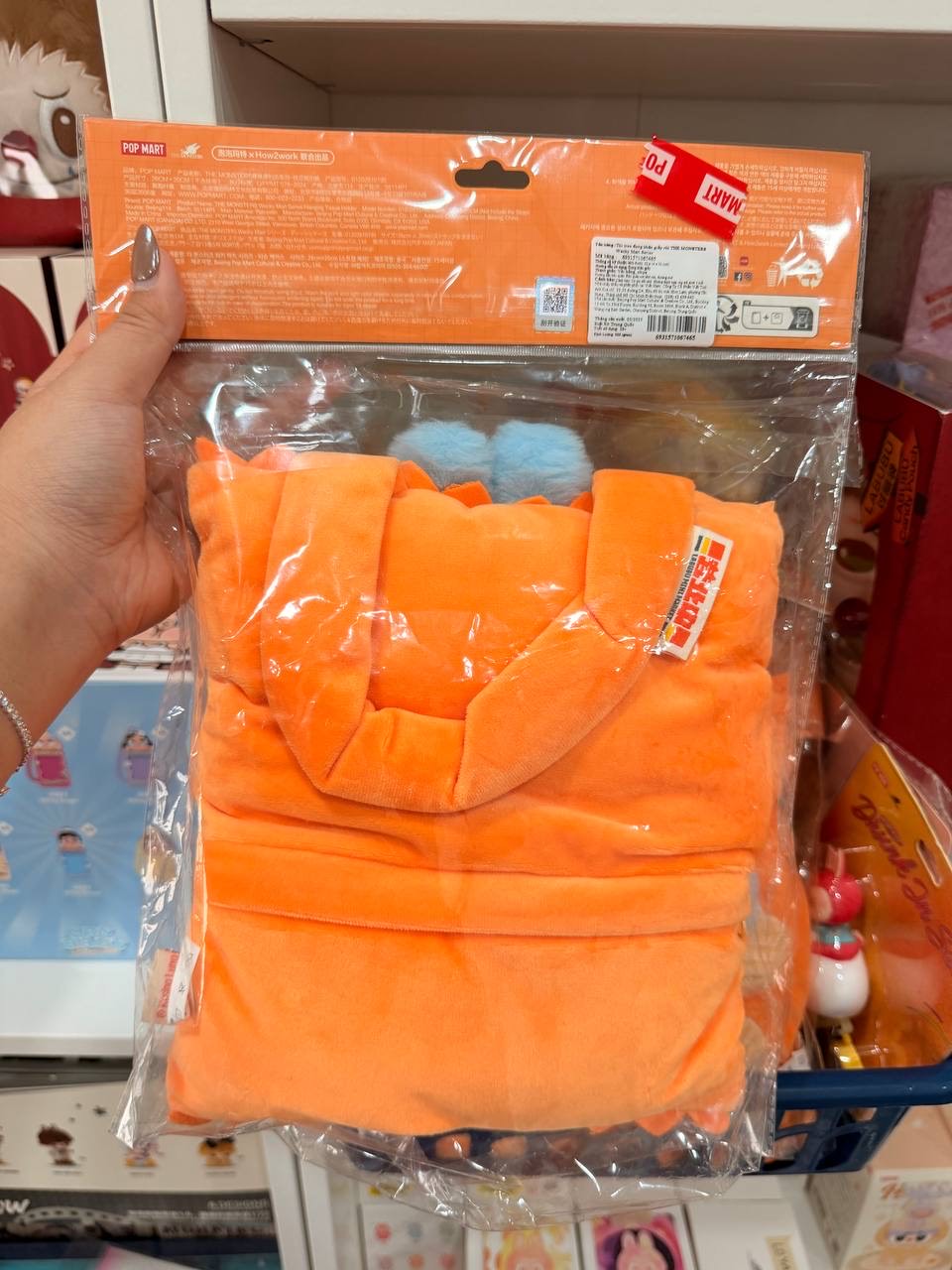 Material: Made of a soft, plush, and velvety orange material with blue fluffy accents (for the Labubu face).